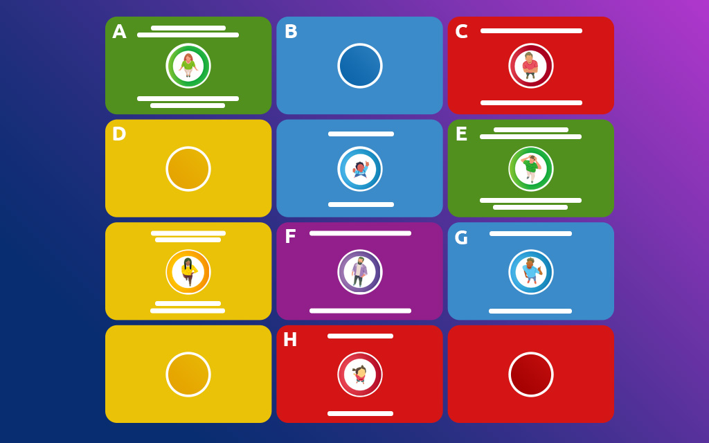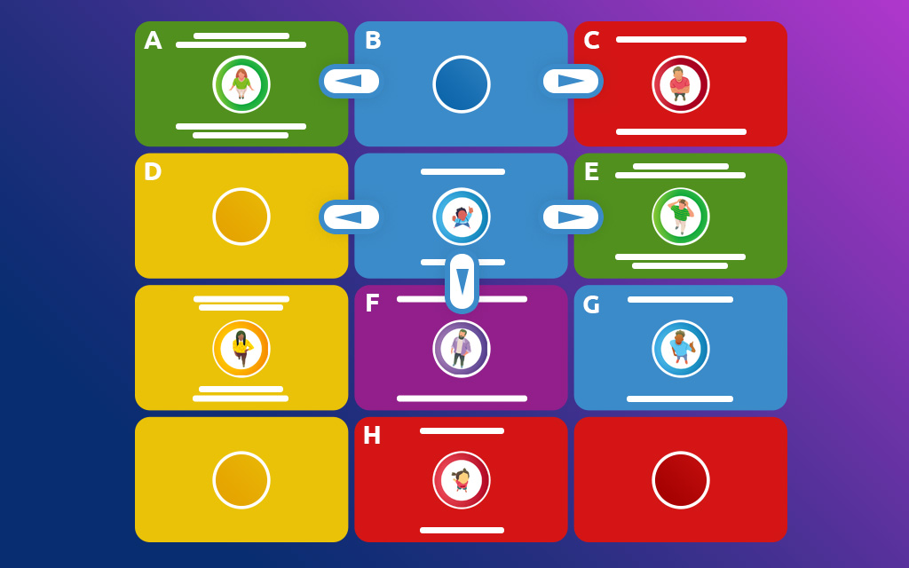 - Duel: Pak de kaarten, start de webapp-klok en noem om de beurt woorden die passen bij de categorie en beginnen met de letters van je kaarten. Degene die als eerste door de tijd heen raakt, verliest.